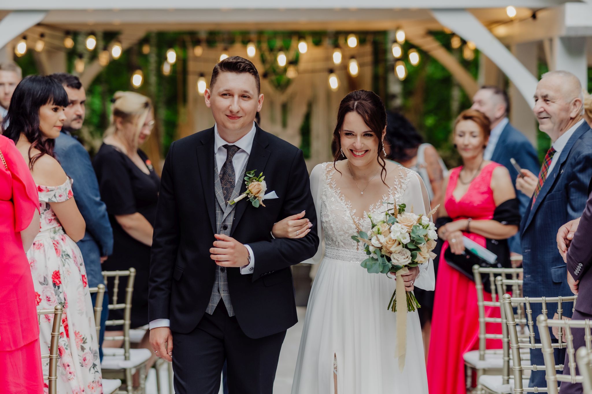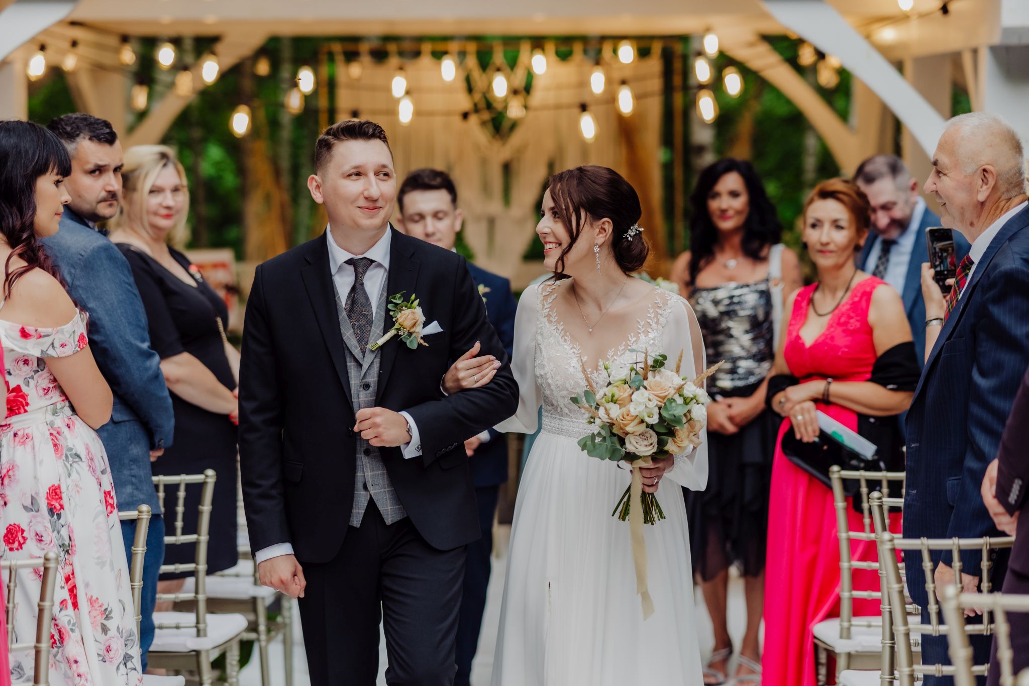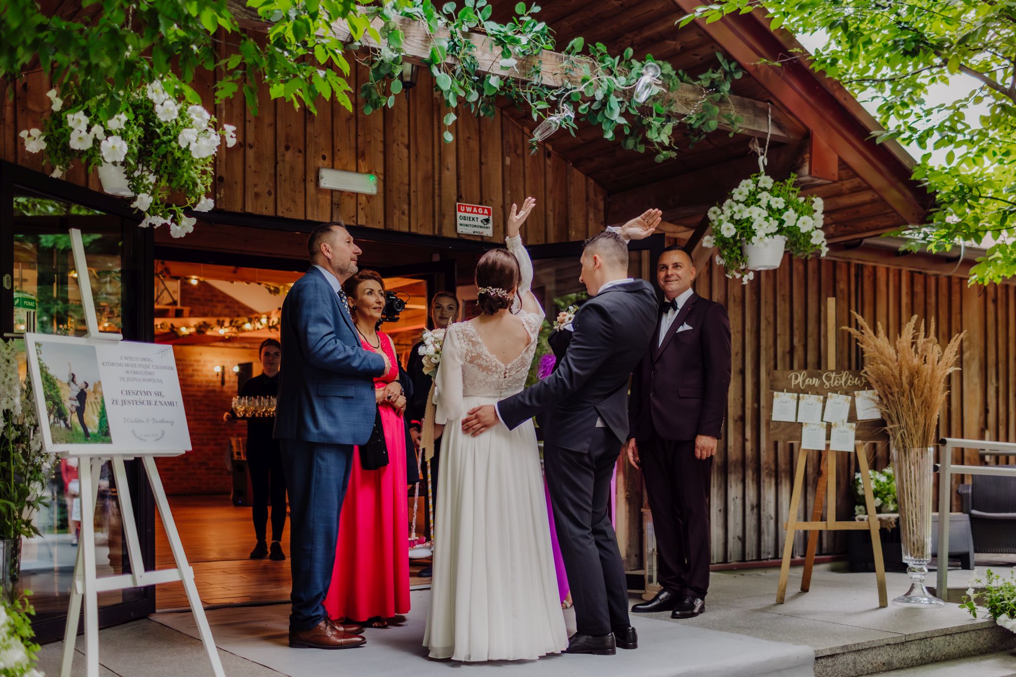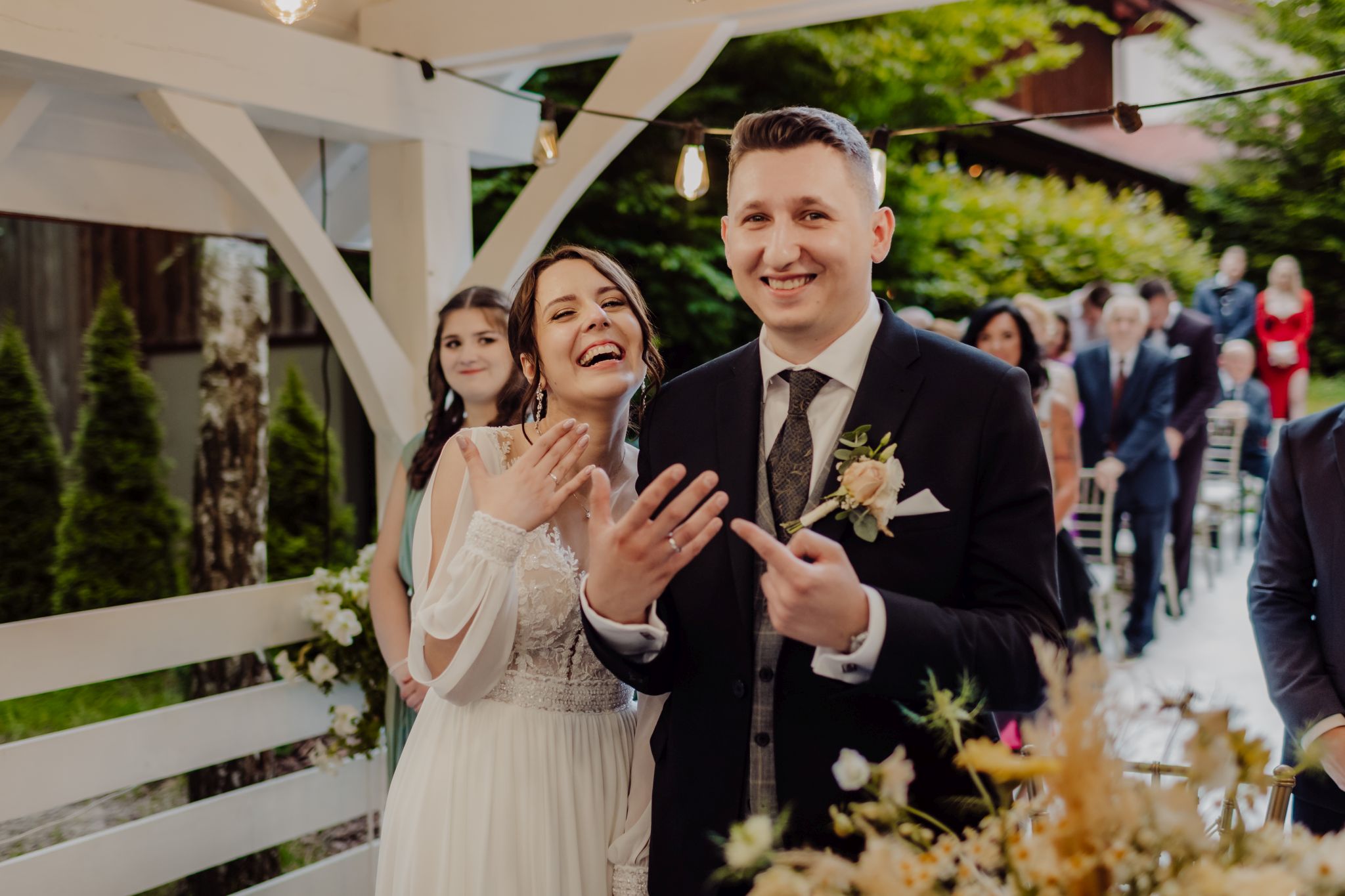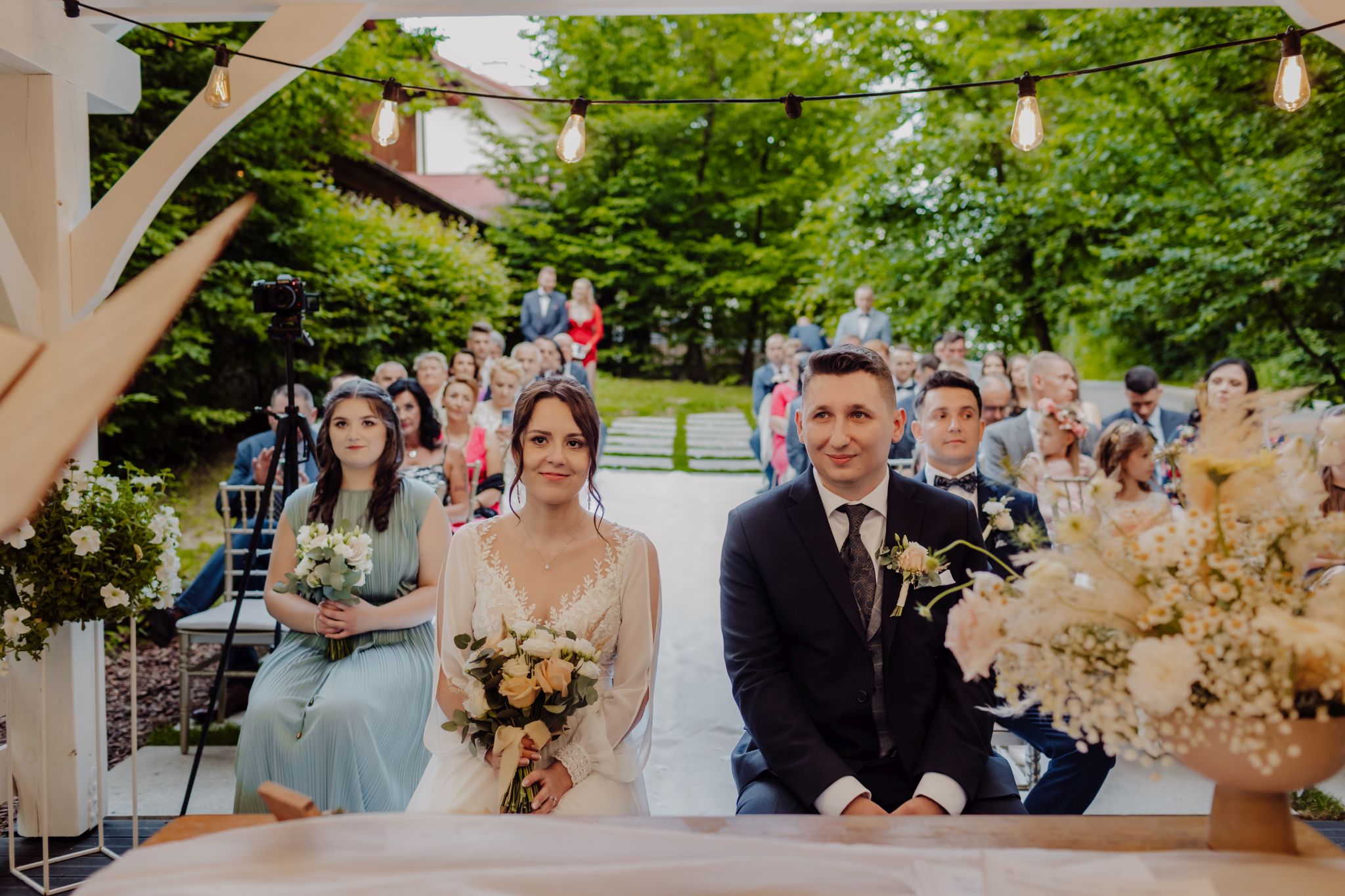 Tutaj wszystko zaczęło się spokojnie — wśród zieleni, w miejscu, gdzie natura robi tło, a nie konkurencję. Ceremonia plenerowa była prosta, lekka i bardzo autentyczna. Bez przesady, bez napięcia — dokładnie tak, jak powinno to wyglądać.