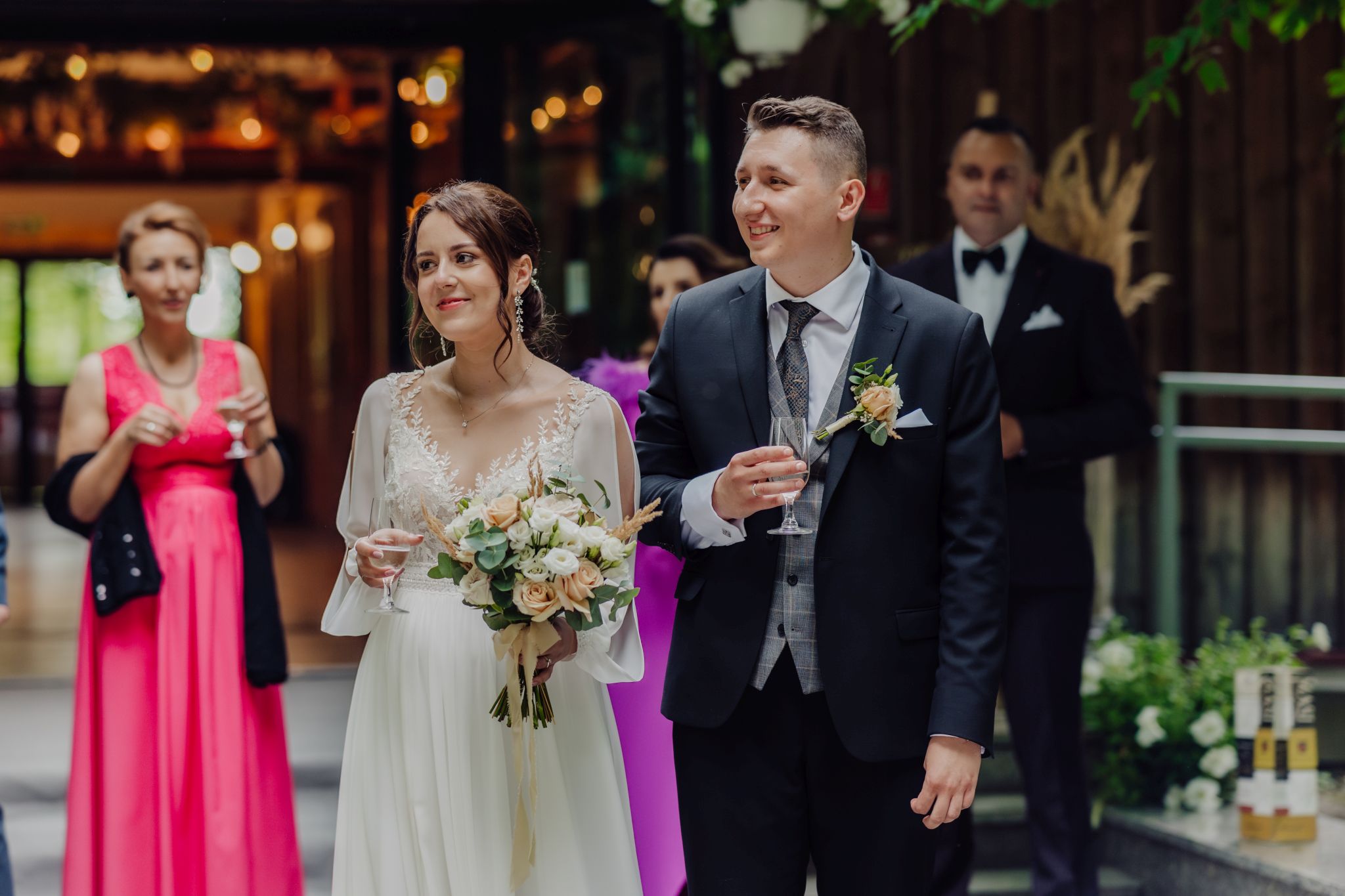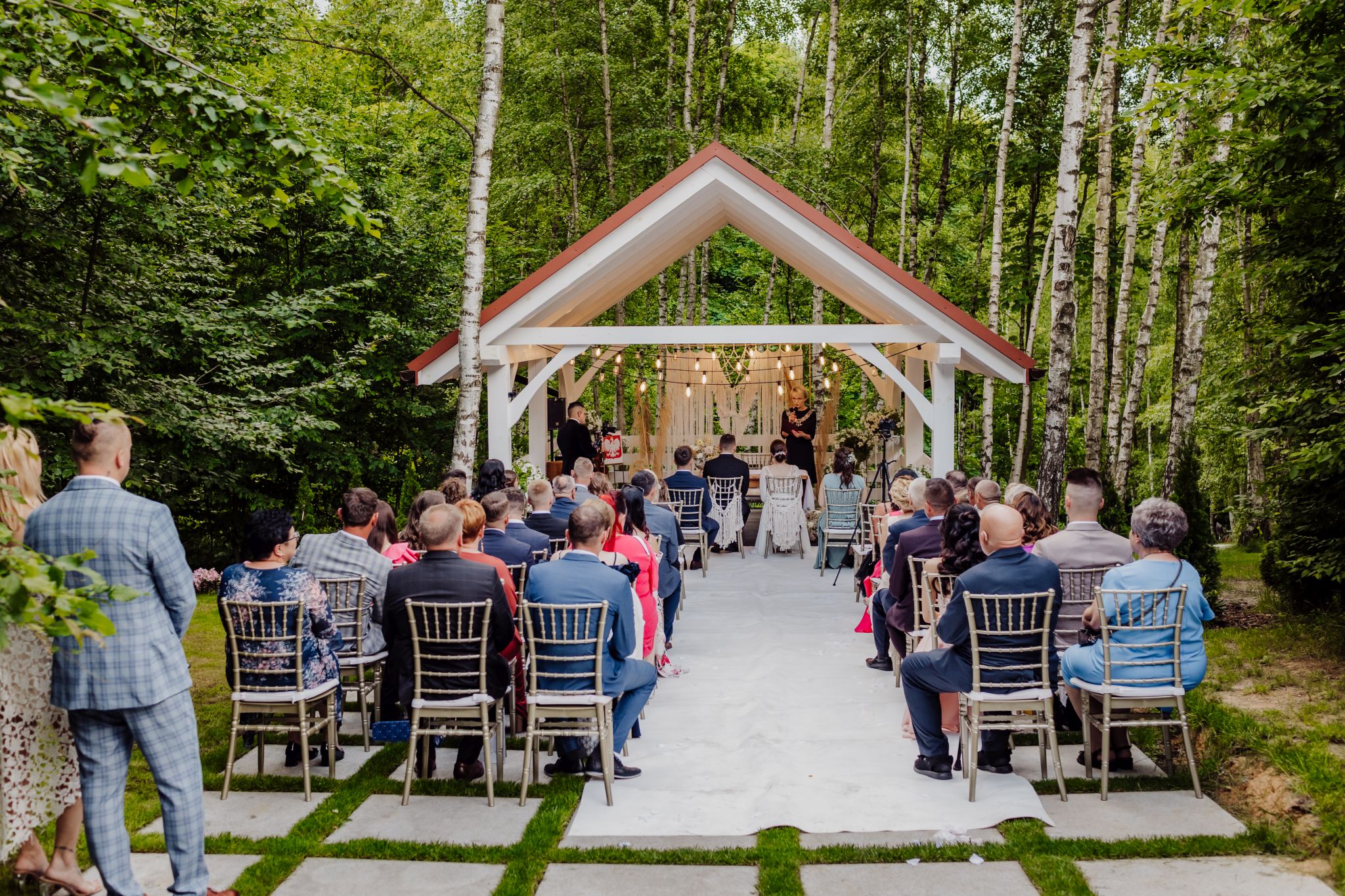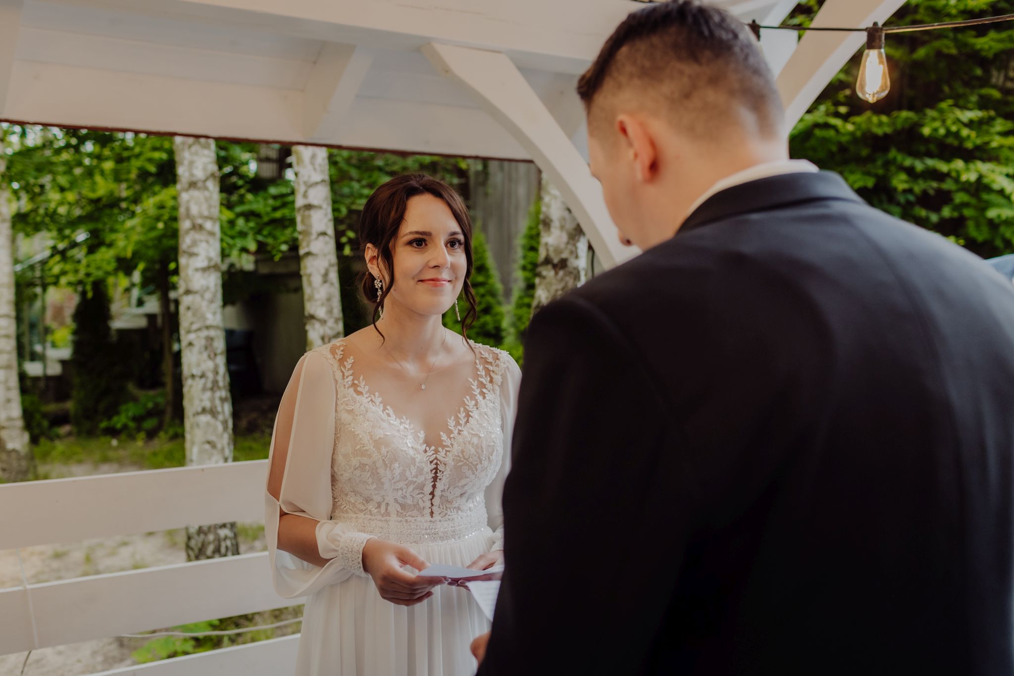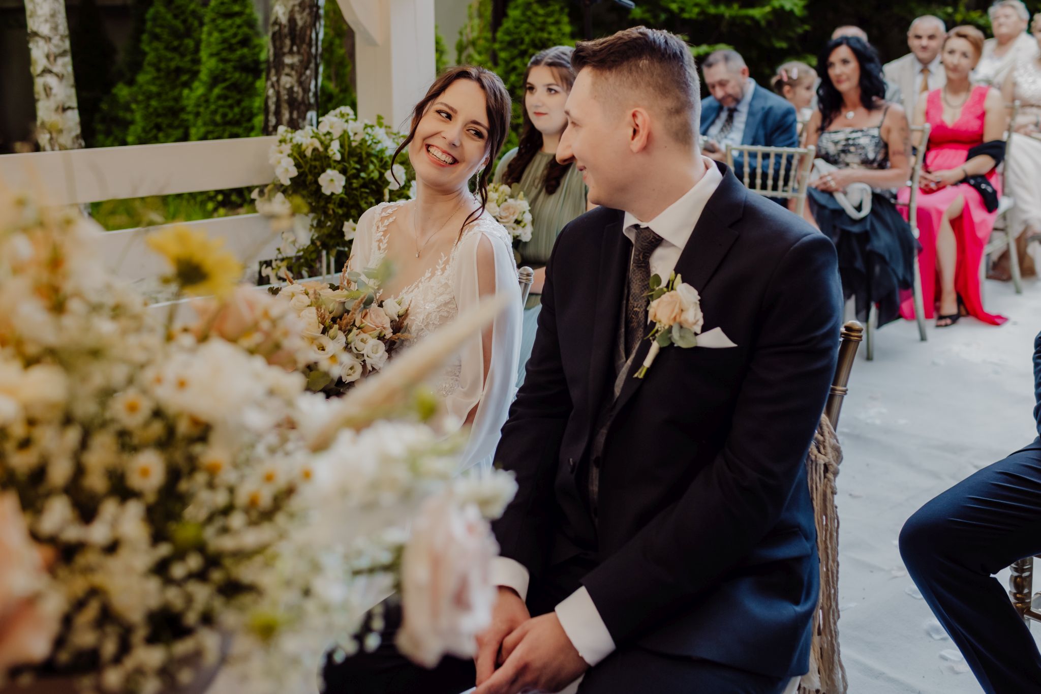 Tutaj wszystko zaczęło się spokojnie — wśród zieleni, w miejscu, gdzie natura robi tło, a nie konkurencję. Ceremonia plenerowa była prosta, lekka i bardzo autentyczna. Bez przesady, bez napięcia — dokładnie tak, jak powinno to wyglądać.