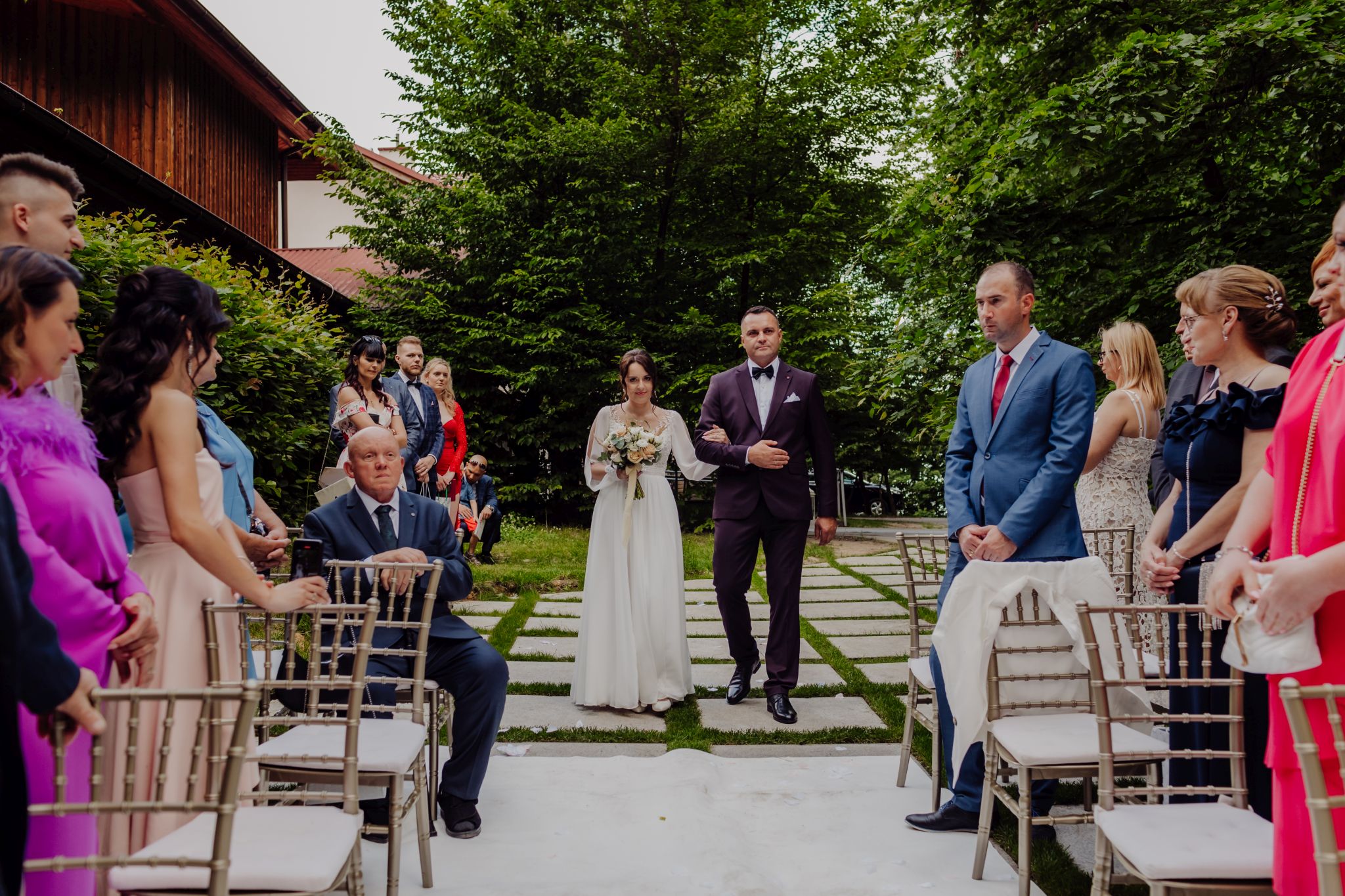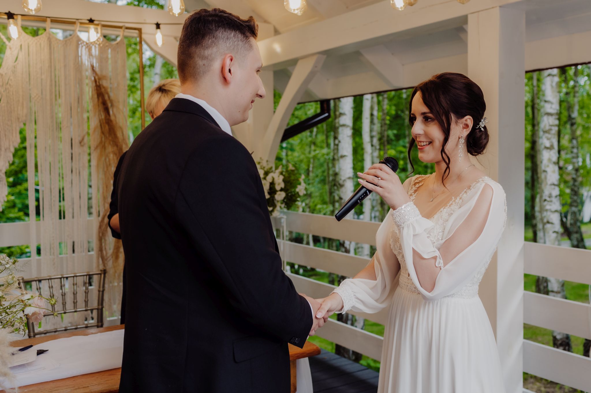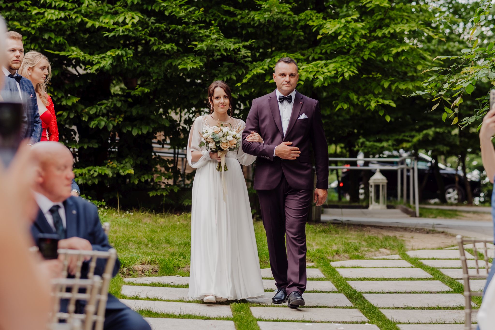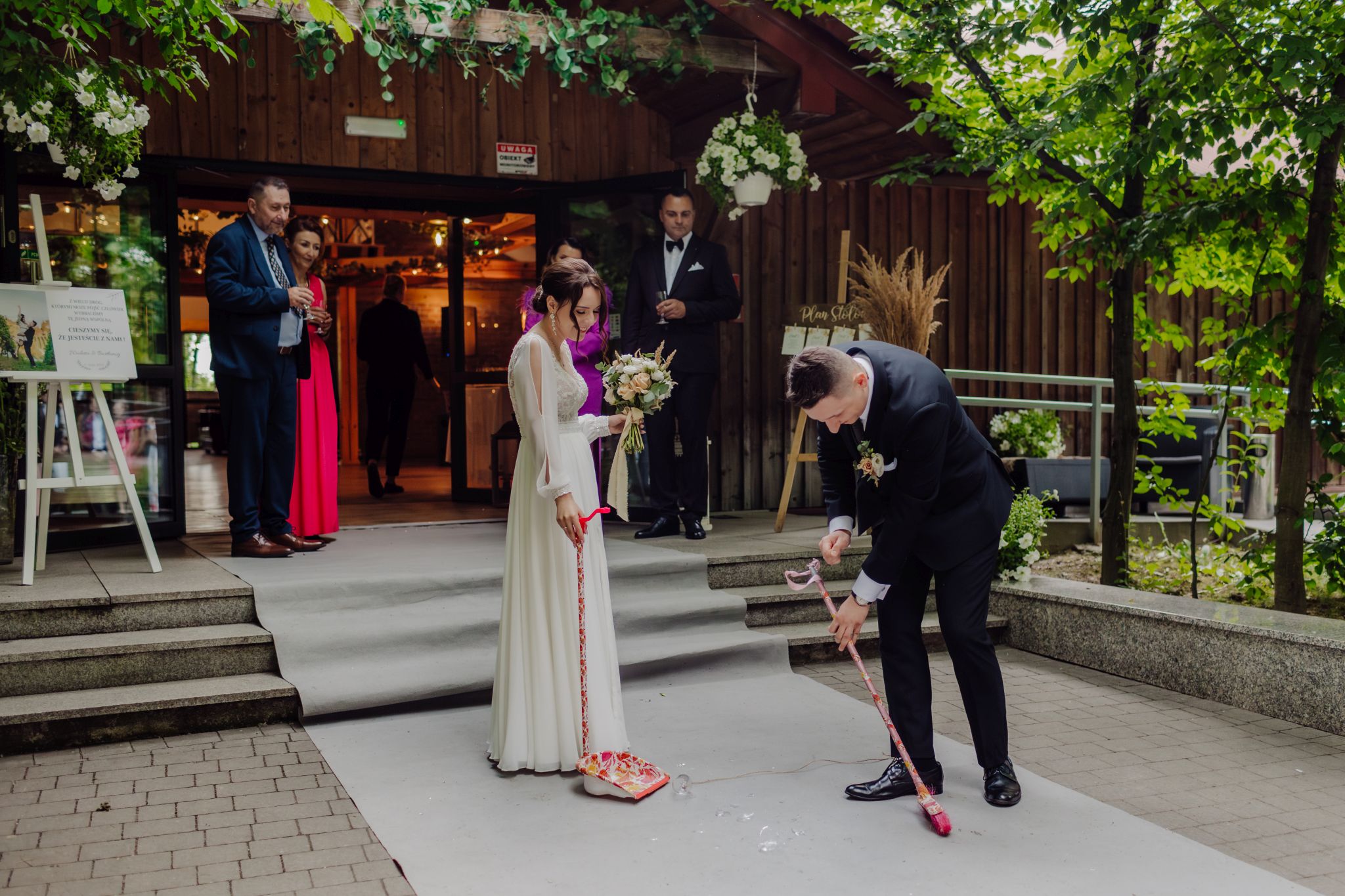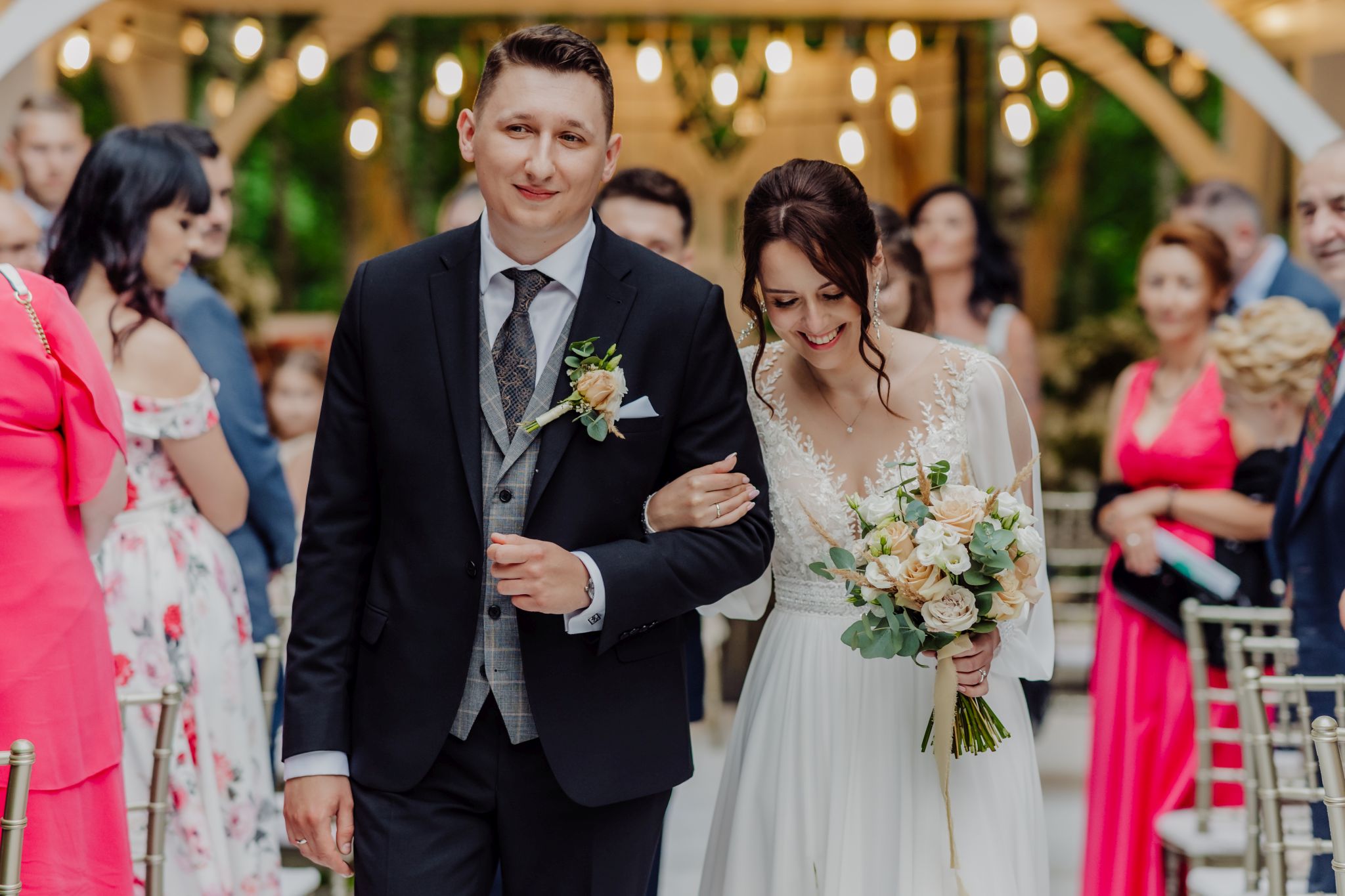 Tutaj wszystko zaczęło się spokojnie — wśród zieleni, w miejscu, gdzie natura robi tło, a nie konkurencję. Ceremonia plenerowa była prosta, lekka i bardzo autentyczna. Bez przesady, bez napięcia — dokładnie tak, jak powinno to wyglądać.
