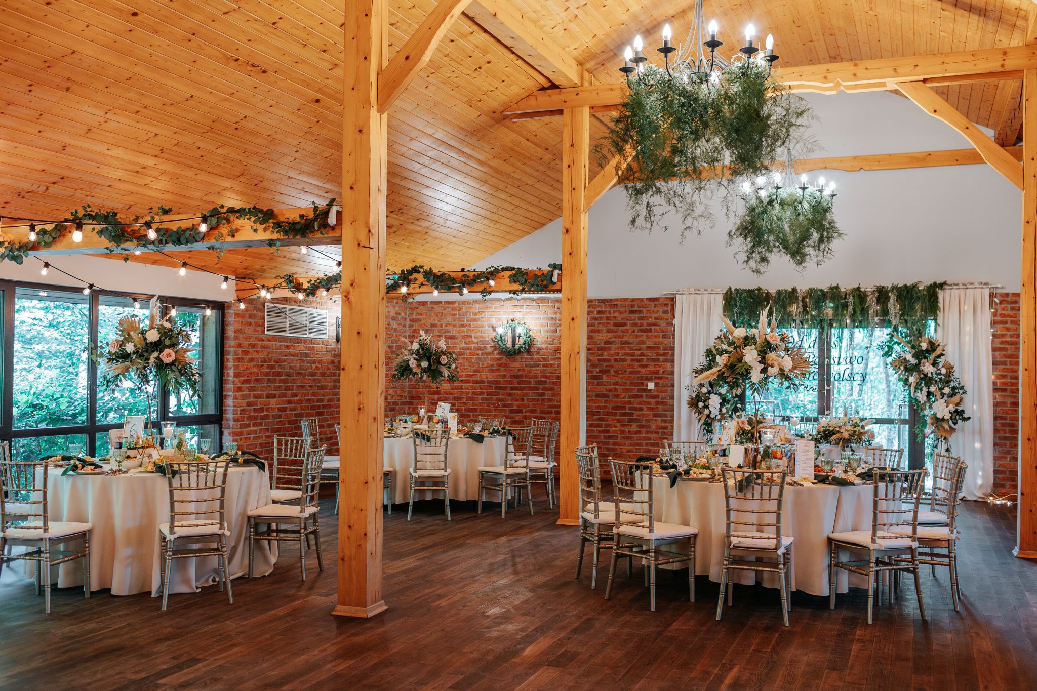 Sala „Stodoła” to zupełnie inny klimat — ciepłe światło, drewno i przestrzeń, która dobrze „pracuje” wieczorem. To jedno z tych miejsc, gdzie parkiet szybko się zapełnia i już tak zostaje do końca.