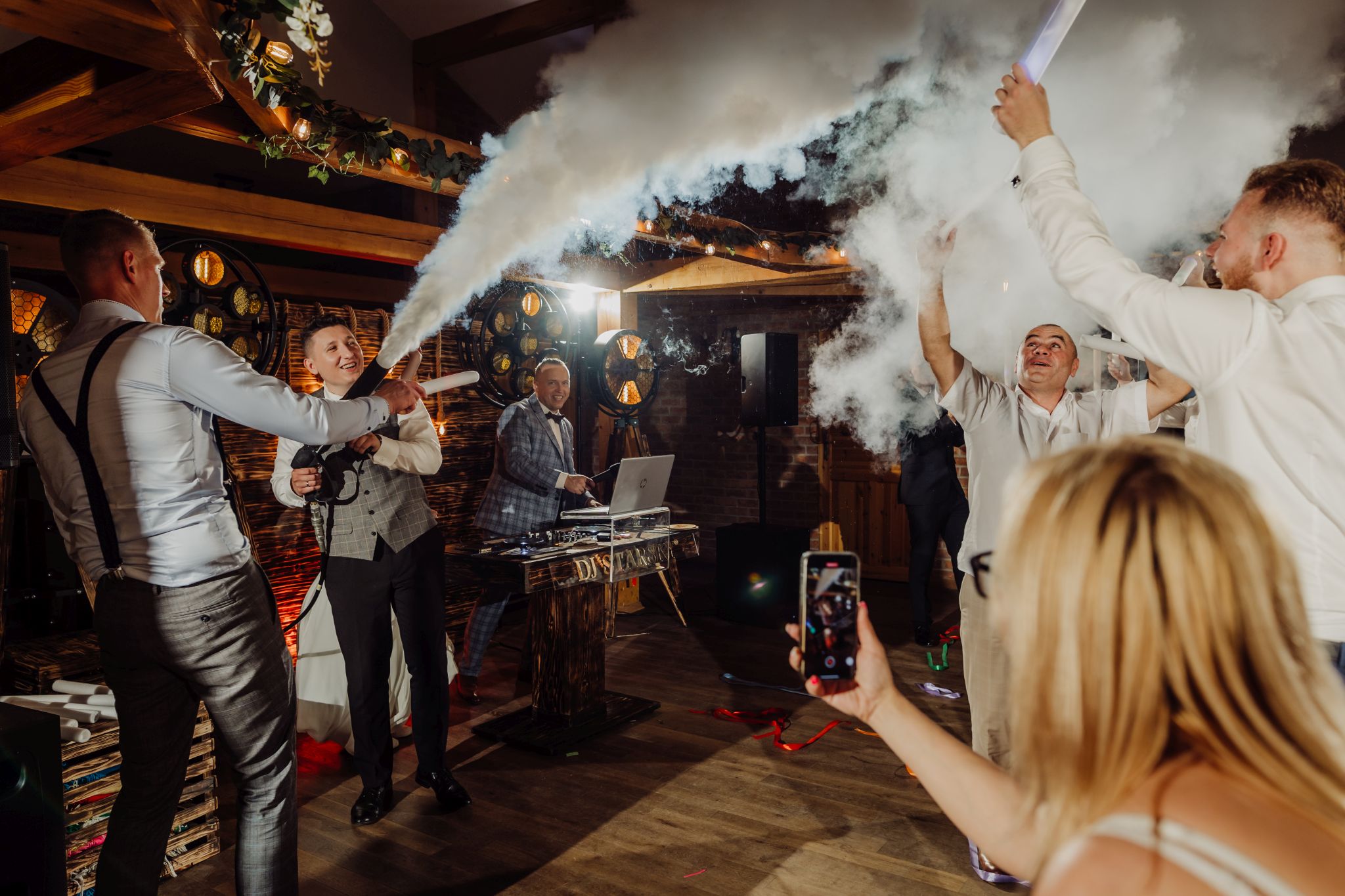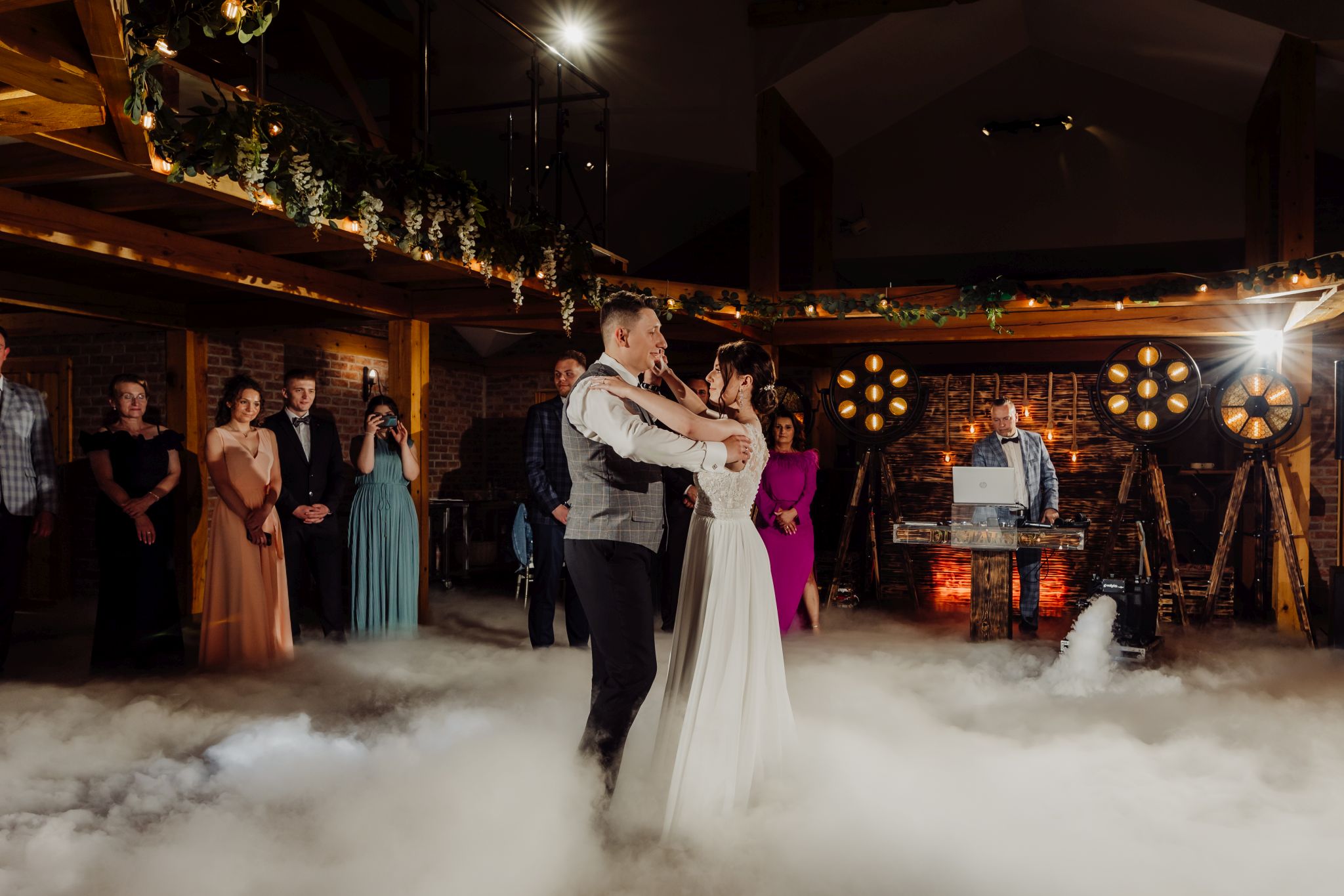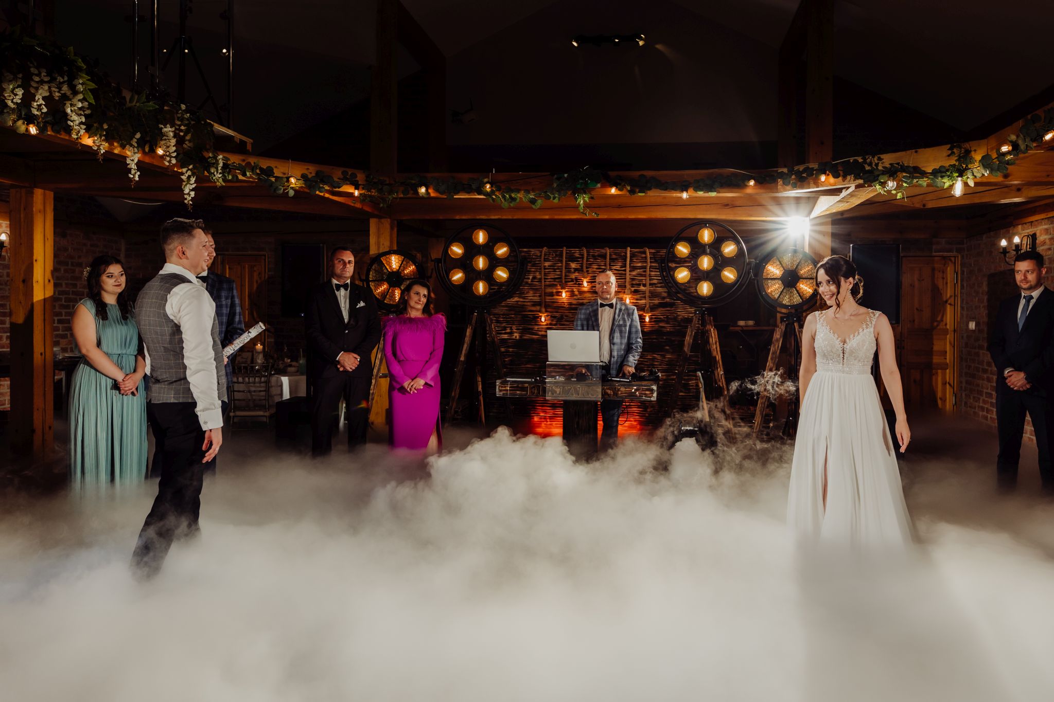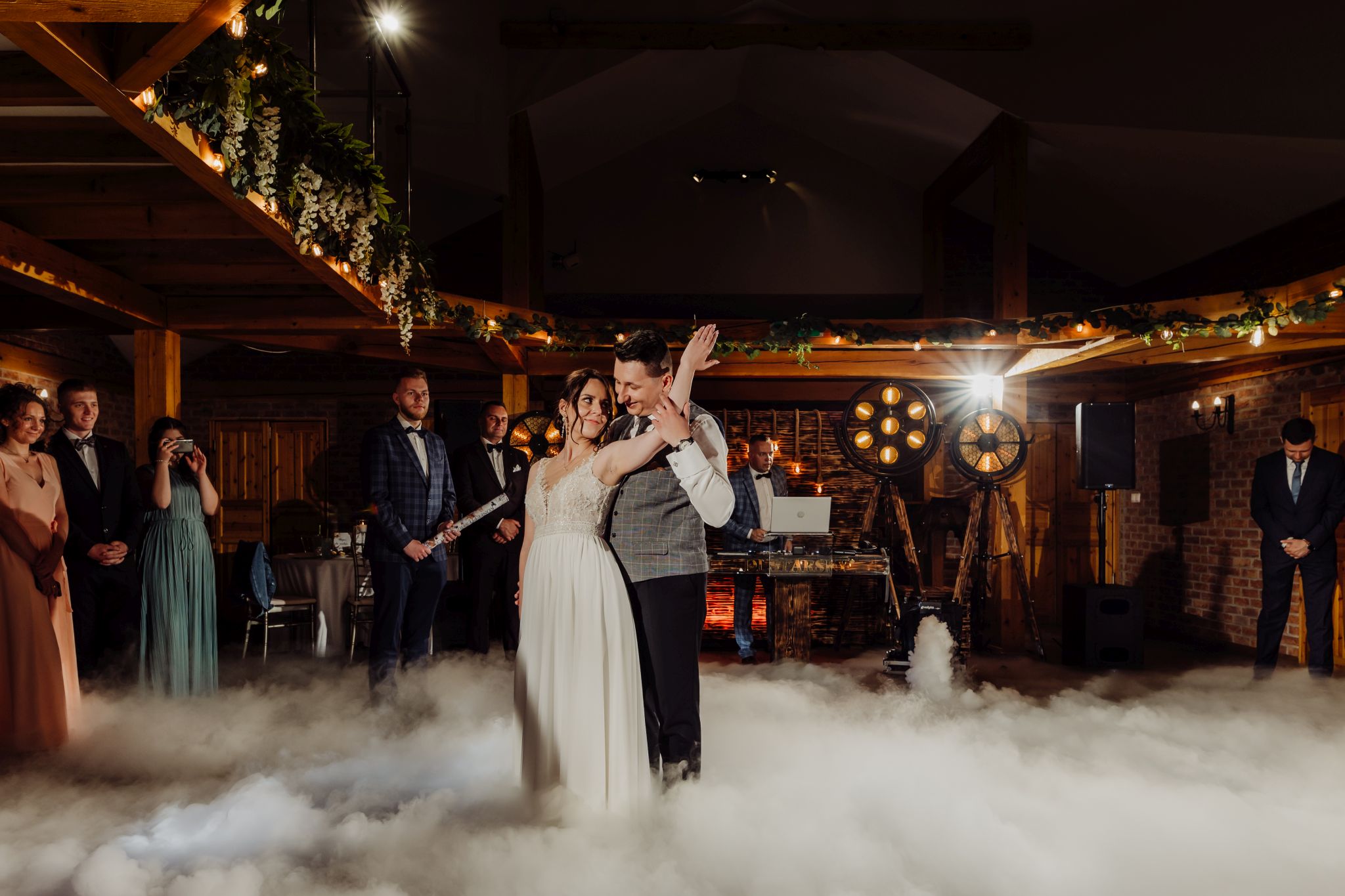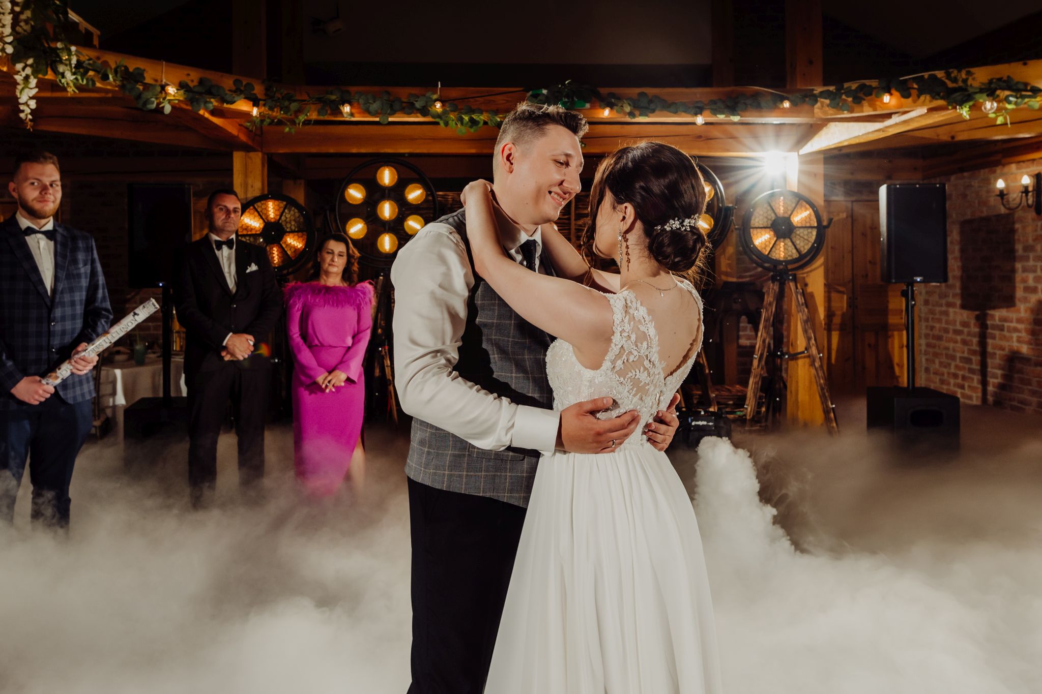 Energia wesela rosła z każdą godziną — od pierwszego tańca w ciężkim dymie, przez spontaniczne momenty na parkiecie, aż po totalny luz pod koniec nocy. DJ zrobił robotę, ale najważniejsze było to, że ludzie po prostu chcieli się bawić.