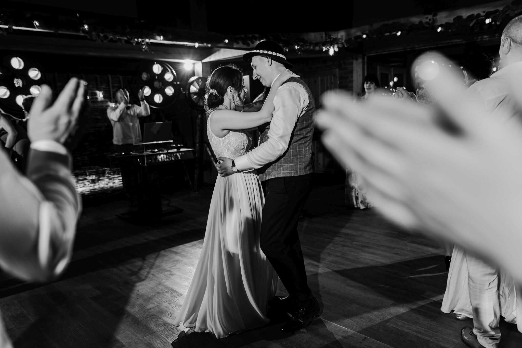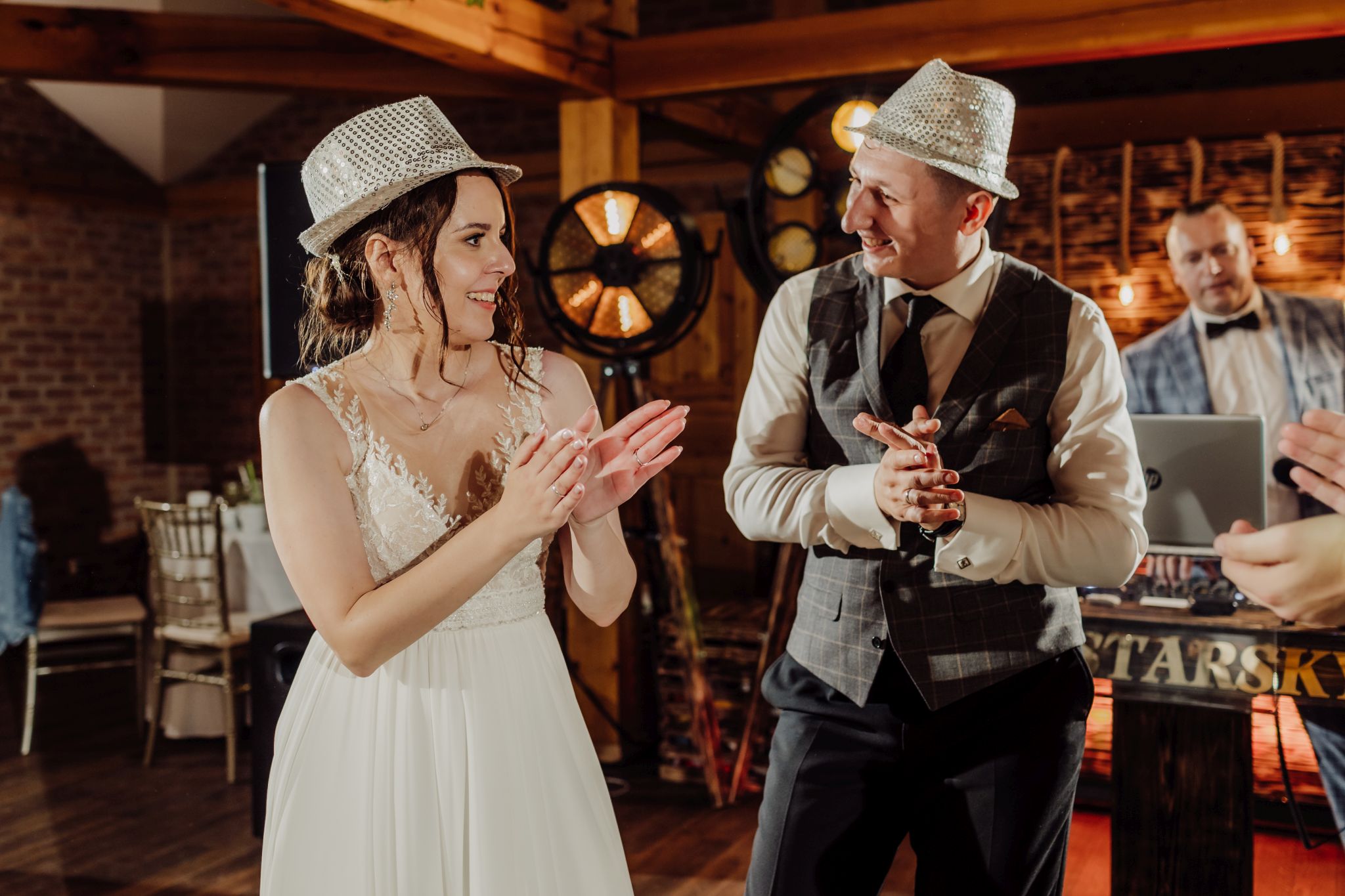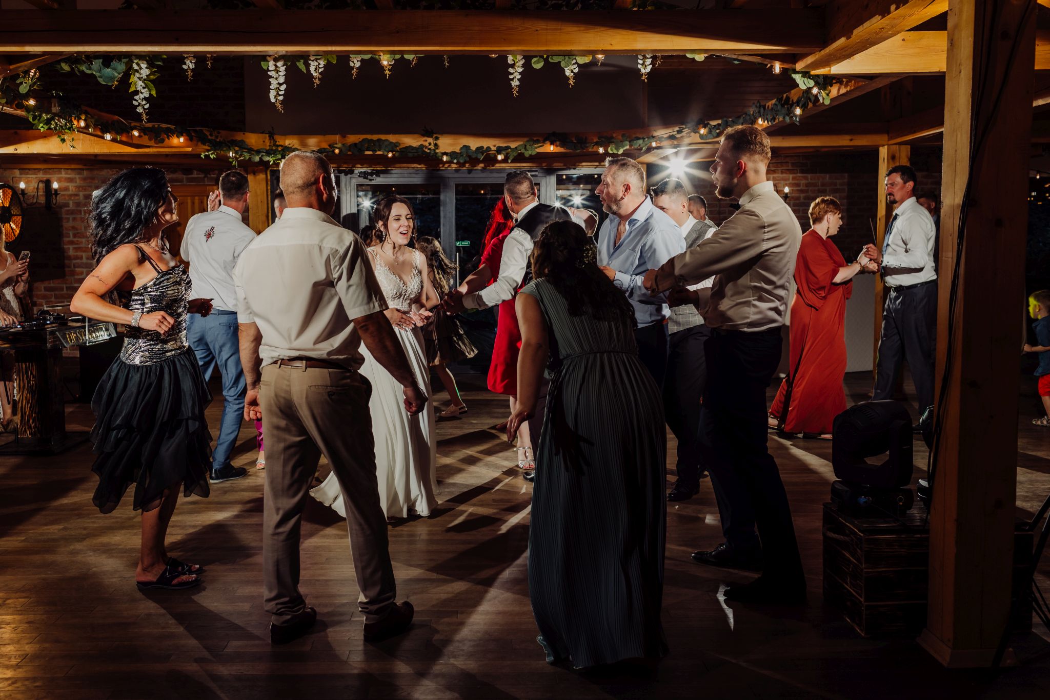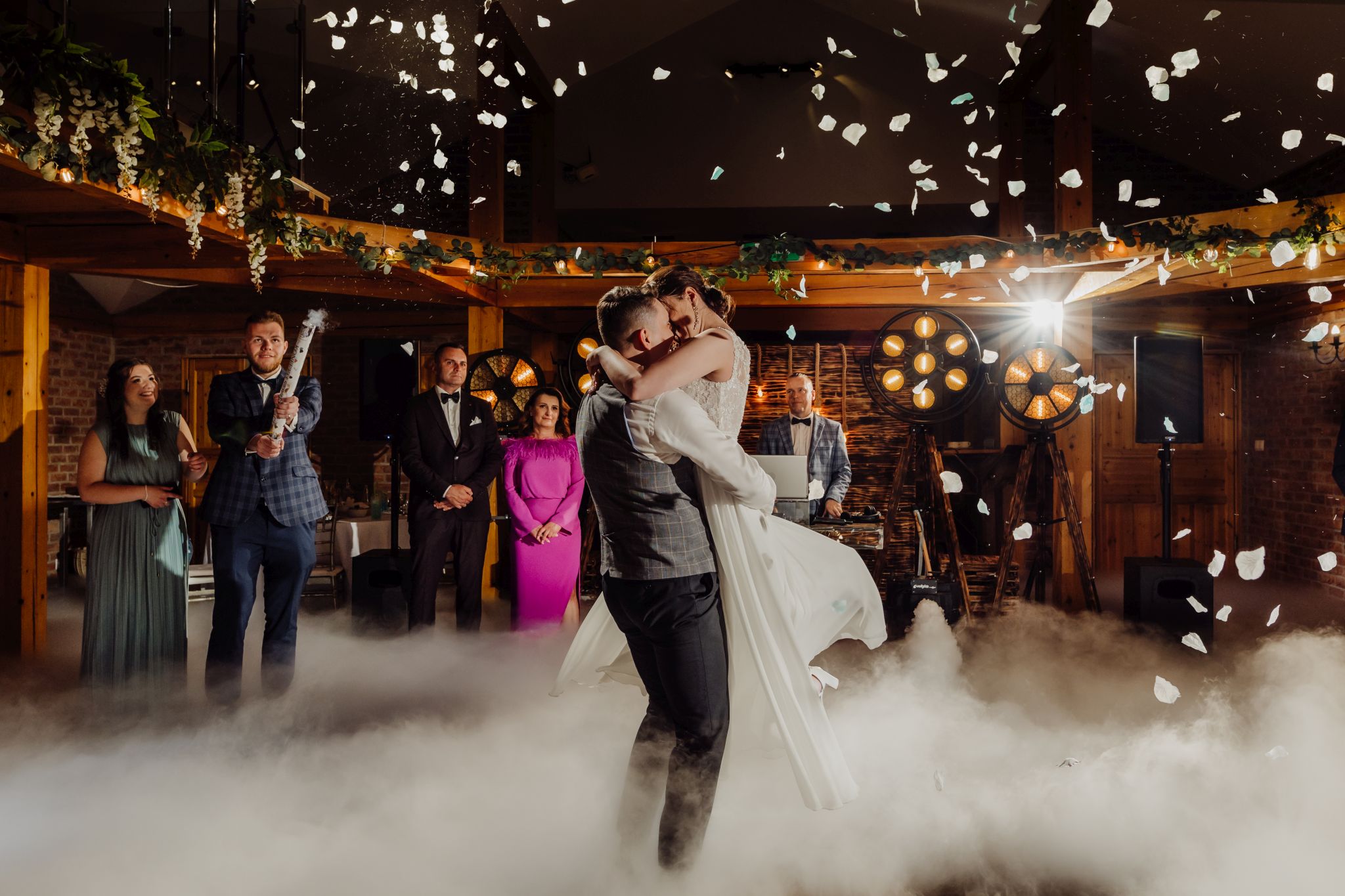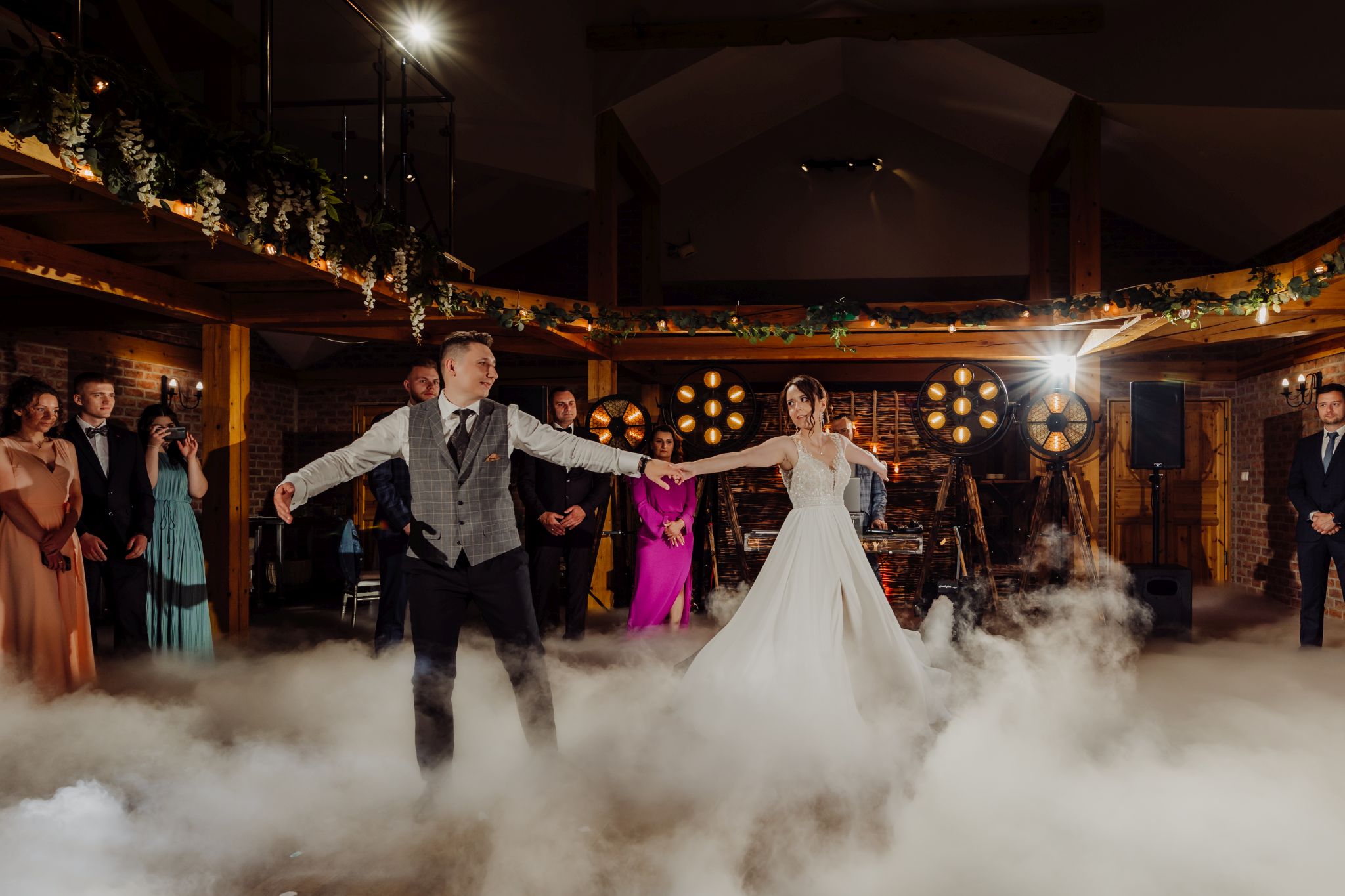 Energia wesela rosła z każdą godziną — od pierwszego tańca w ciężkim dymie, przez spontaniczne momenty na parkiecie, aż po totalny luz pod koniec nocy. DJ zrobił robotę, ale najważniejsze było to, że ludzie po prostu chcieli się bawić.